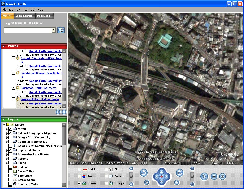 簡単に言ってしまえば衛星写真で地球のどこでも見れますよって感じのソフトなんですが、大都市だとかなり詳しく地上の様子が確認できたりします